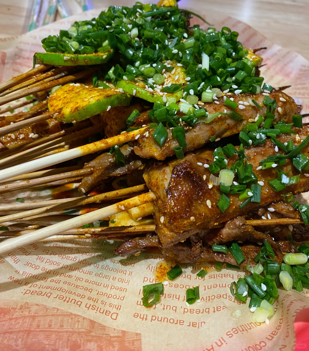 从陶香出来,我坐地铁7号线两站到长寿路,走路5分钟。店面只有6张桌子,炭炉直接摆门口,师傅一边扇火一边撒辣子,辣得路人直咳嗽。我点了10串五花肉+5串牛油+1份萝卜丁,正常辣。第一口肉汁爆开,第二口辣椒冲脑门,配免费的冰镇萝卜丁,酸脆解辣,一秒回魂。最后结账79,老板抹了零,还送一杯自酿梅子酒。